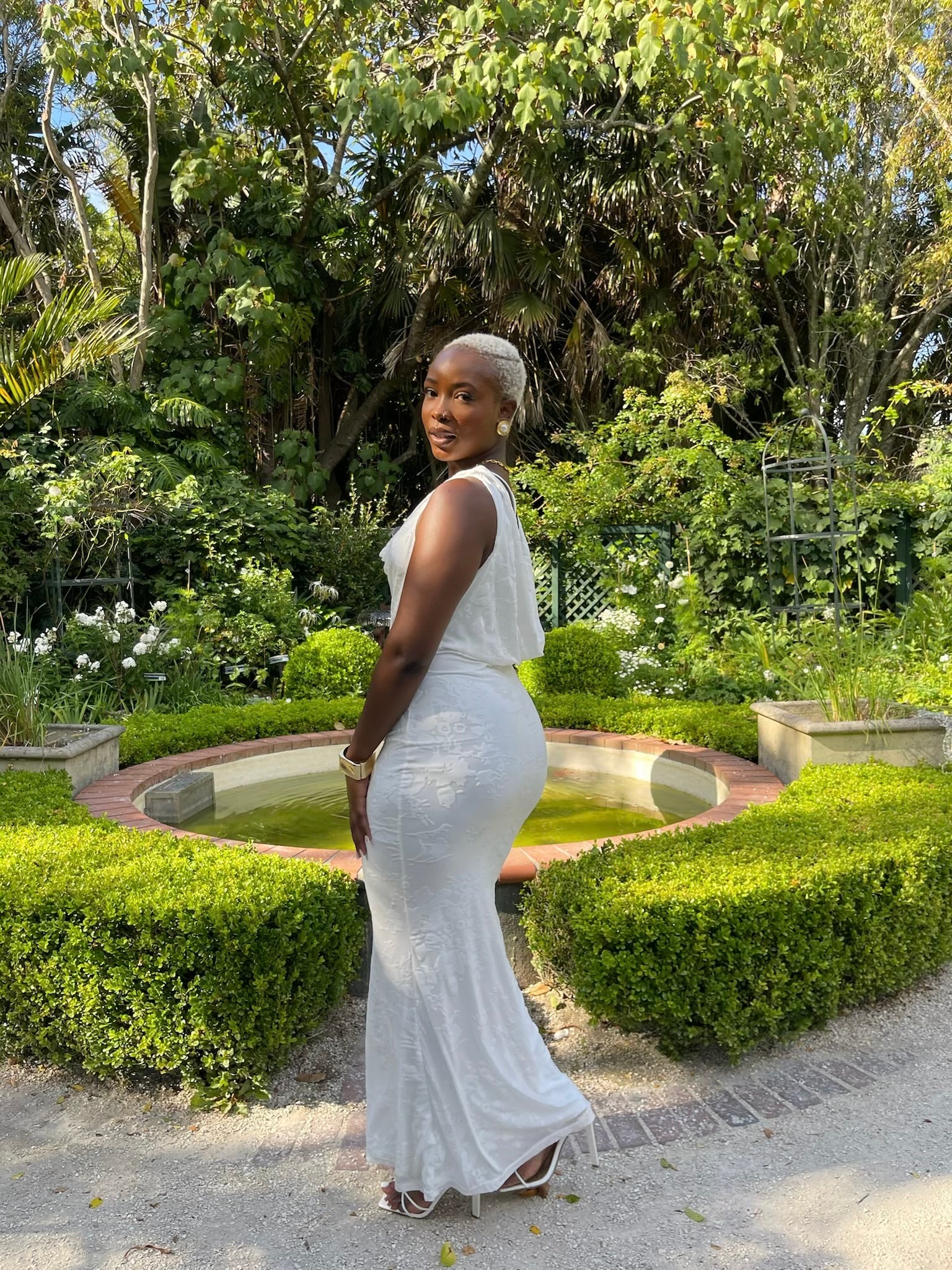 Introducing the Michal Dress from Ferox Boutique's Valentine’s Collection – a vision of love and beauty, just like its name, "Michal," meaning brook or stream. This white floral-embossed velvet gown is the perfect blend of sophistication and romance, designed for the modern woman who desires elegance with a touch of allure.