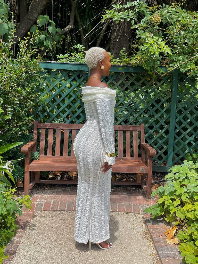 The off-the-shoulder neckline paired with flirty, long sheer lace sleeves creates an ethereal look, while the delicate white rose detailing on the sweetheart neckline adds a touch of timeless charm. Crafted from high-stretch fabric with a convenient back zipper, the Zohar Dress offers a flawless fit that highlights your natural beauty with ease.