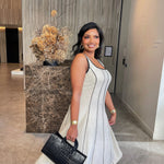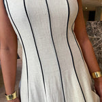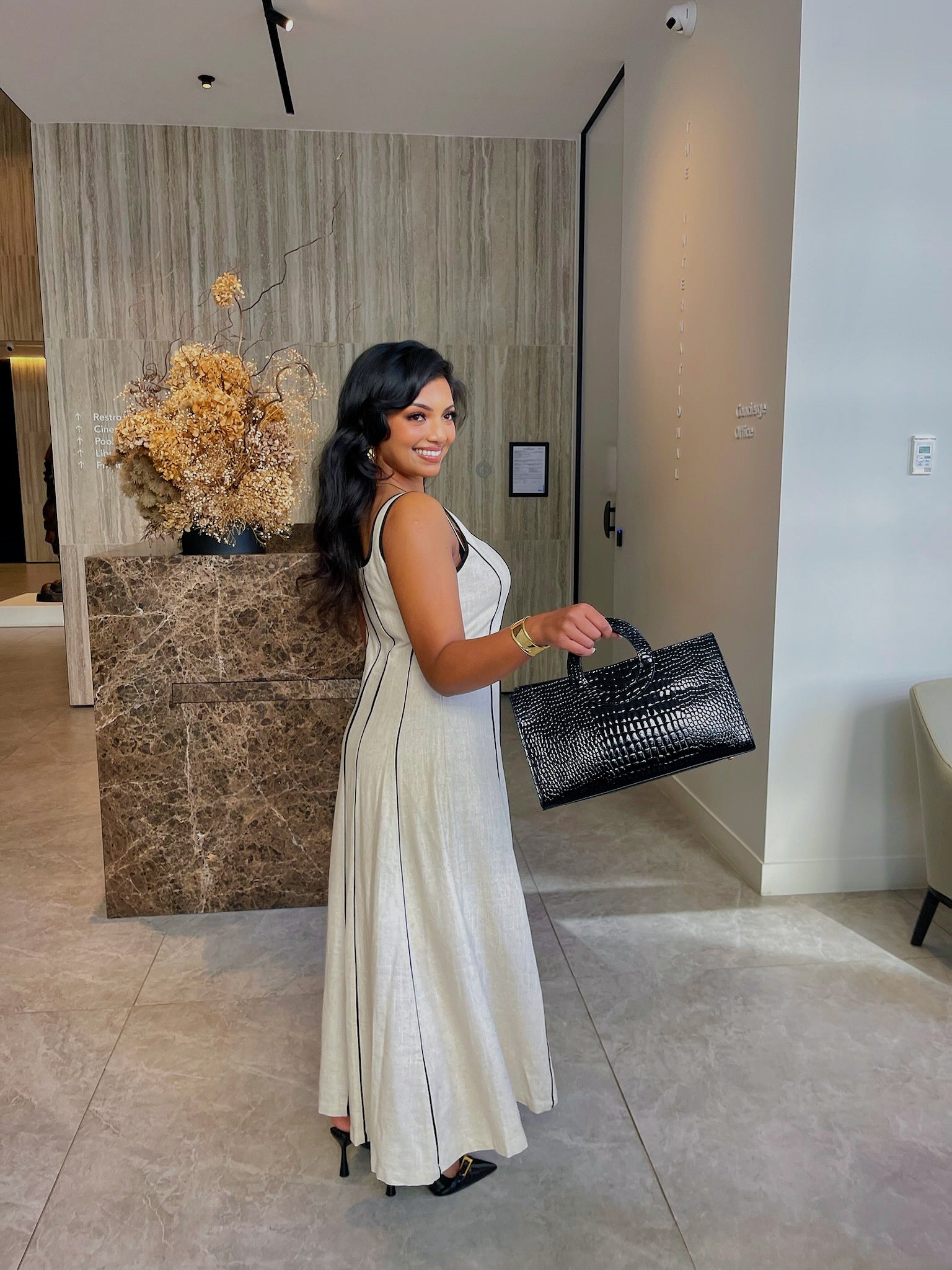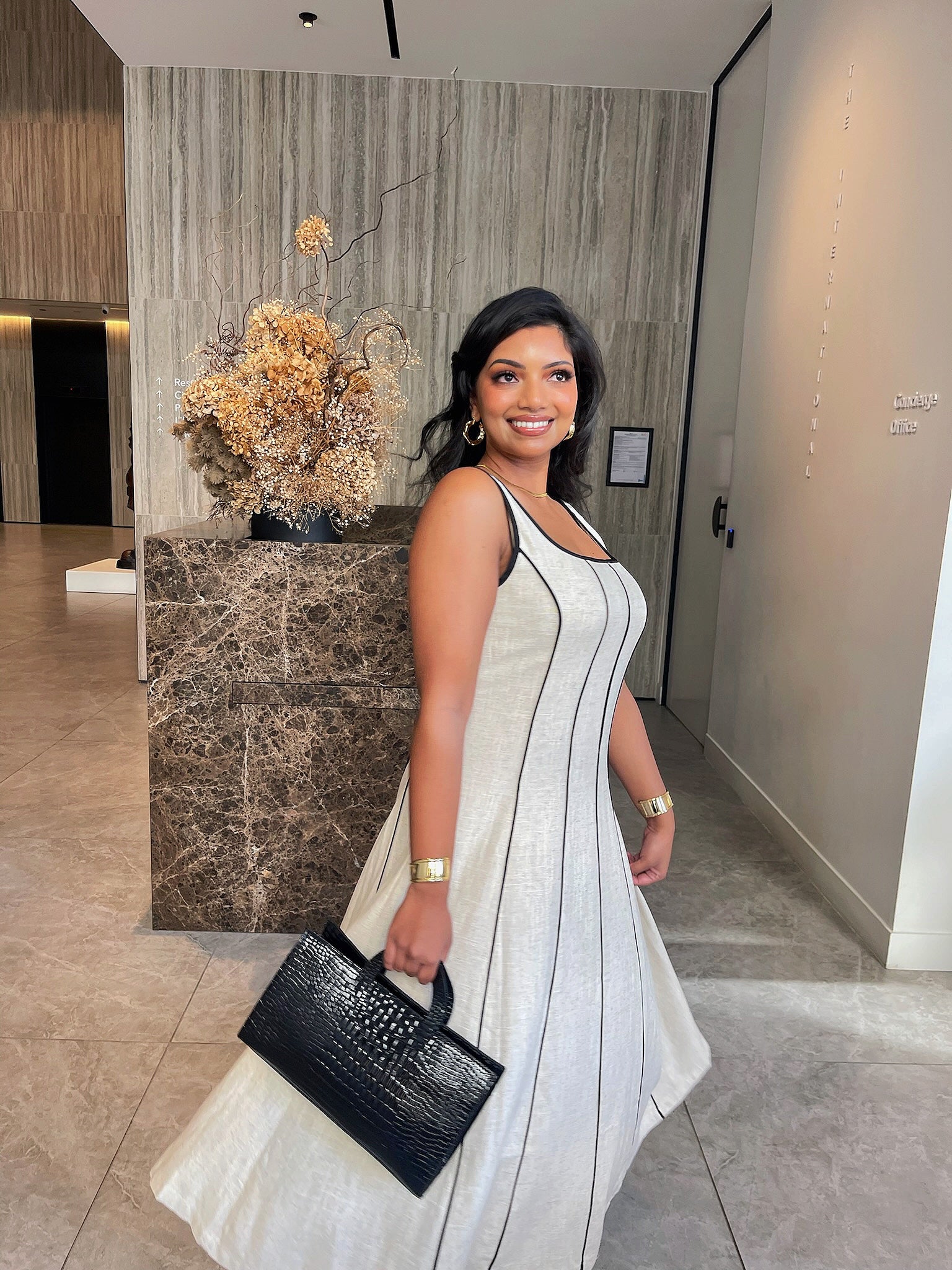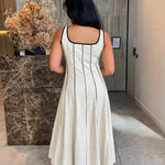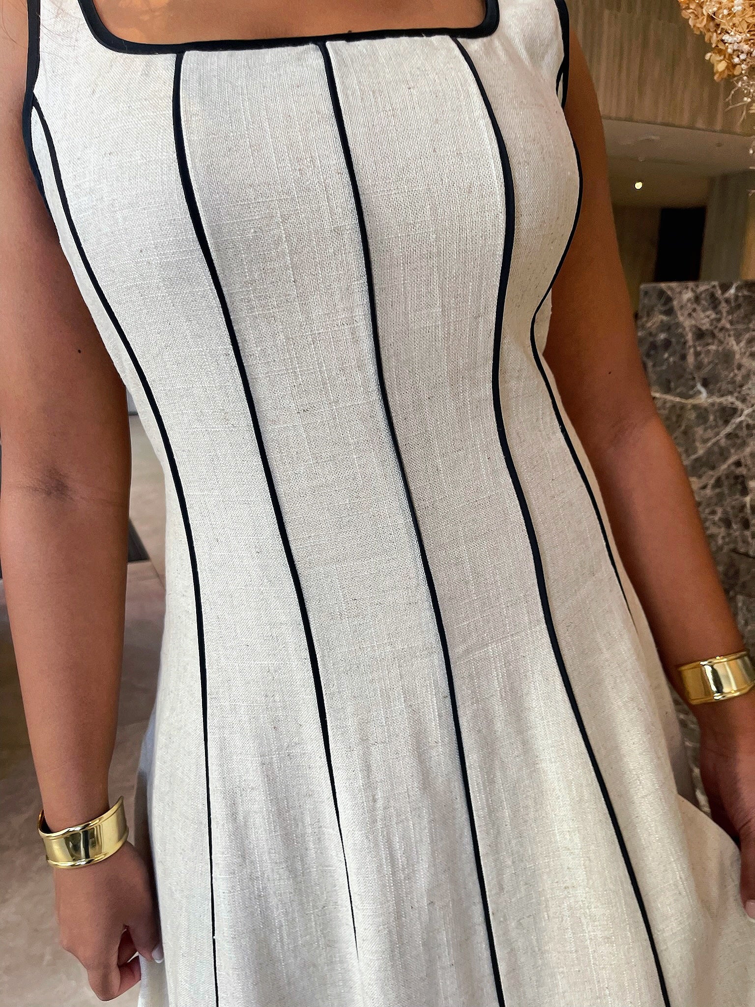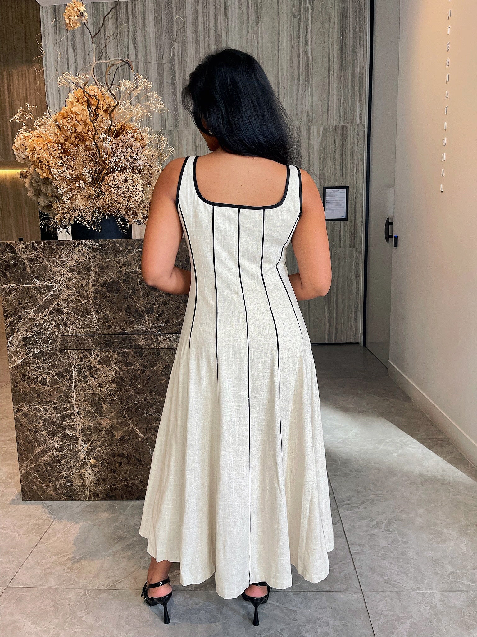 This dress exudes premium quality, designed for the sophisticated woman who knows her worth. Crafted from heavyweight luxurious linen, it features a stylish square neckline that adds a touch of elegance. The flared design is enhanced by contrasting black hemlines, making it a standout piece in any wardrobe.