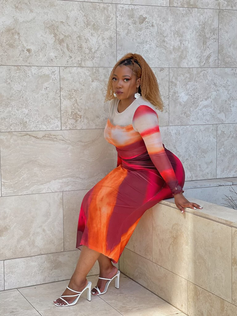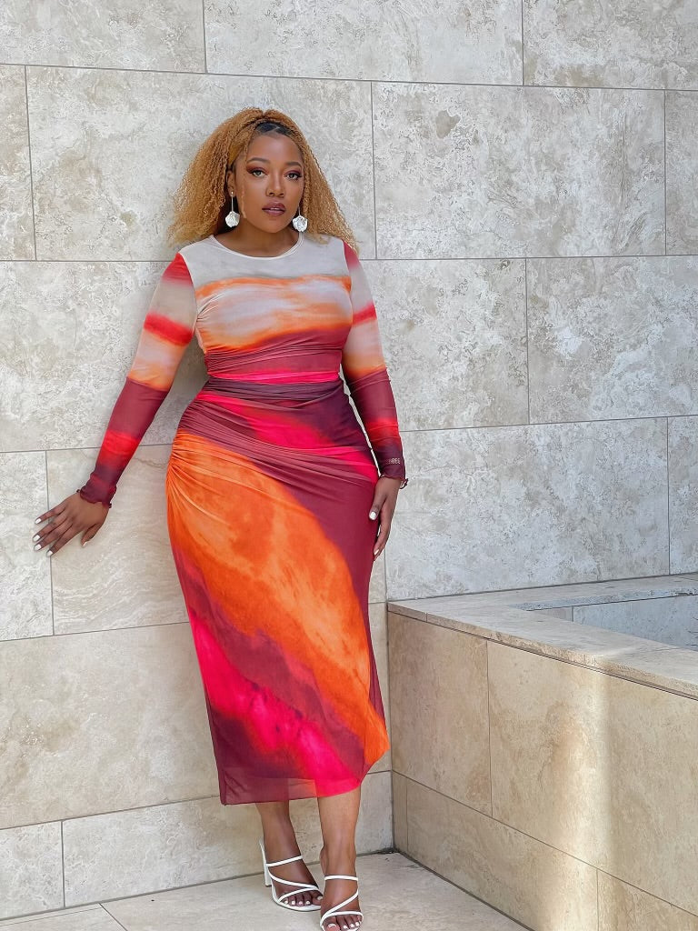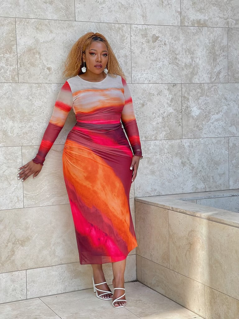 Elevate your style and command attention with our captivating dress, meticulously crafted to accentuate your curves flawlessly. Featuring long sleeves and adorned in a mesmerizing high-stretch pattern material of rich hues including red, orange, and beige. This dress is guaranteed to make you the centre of admiration wherever you go.