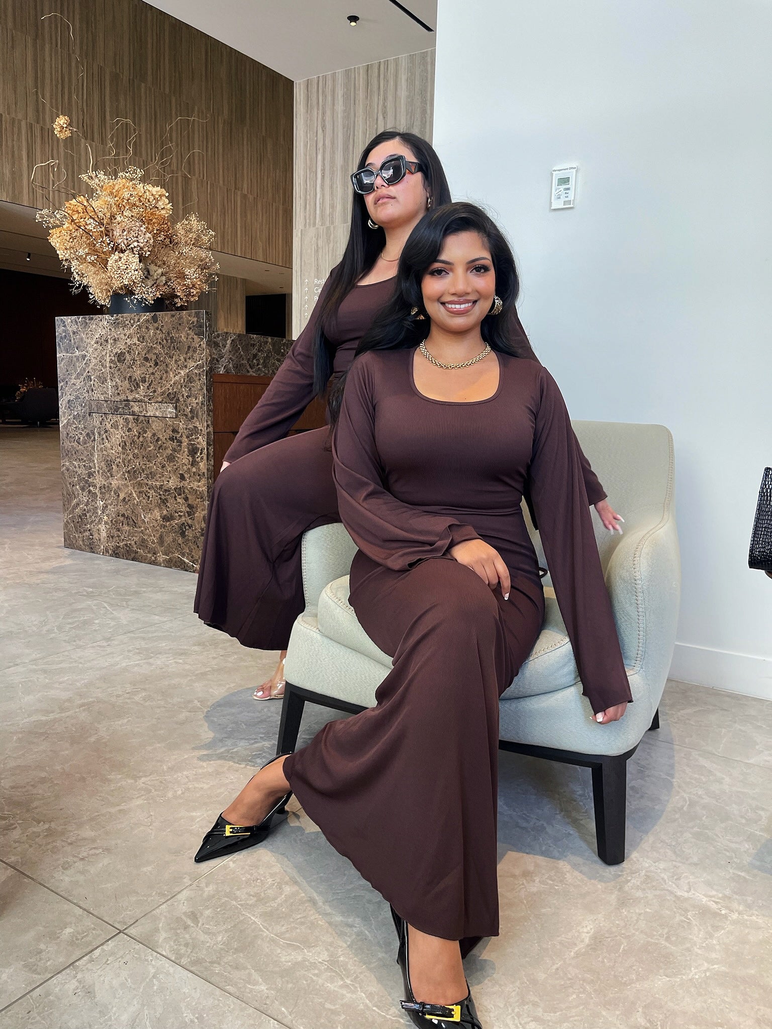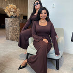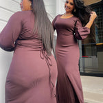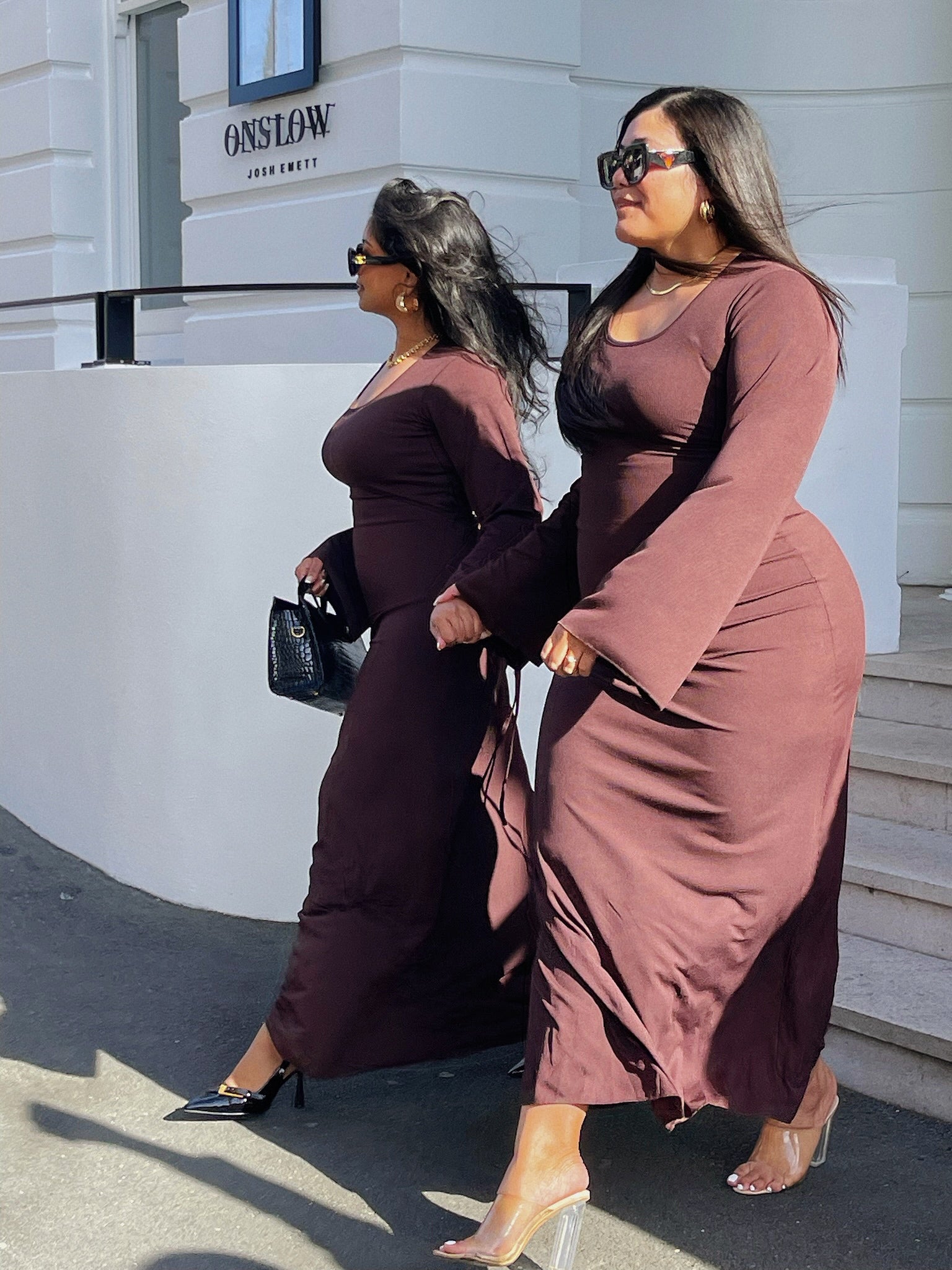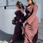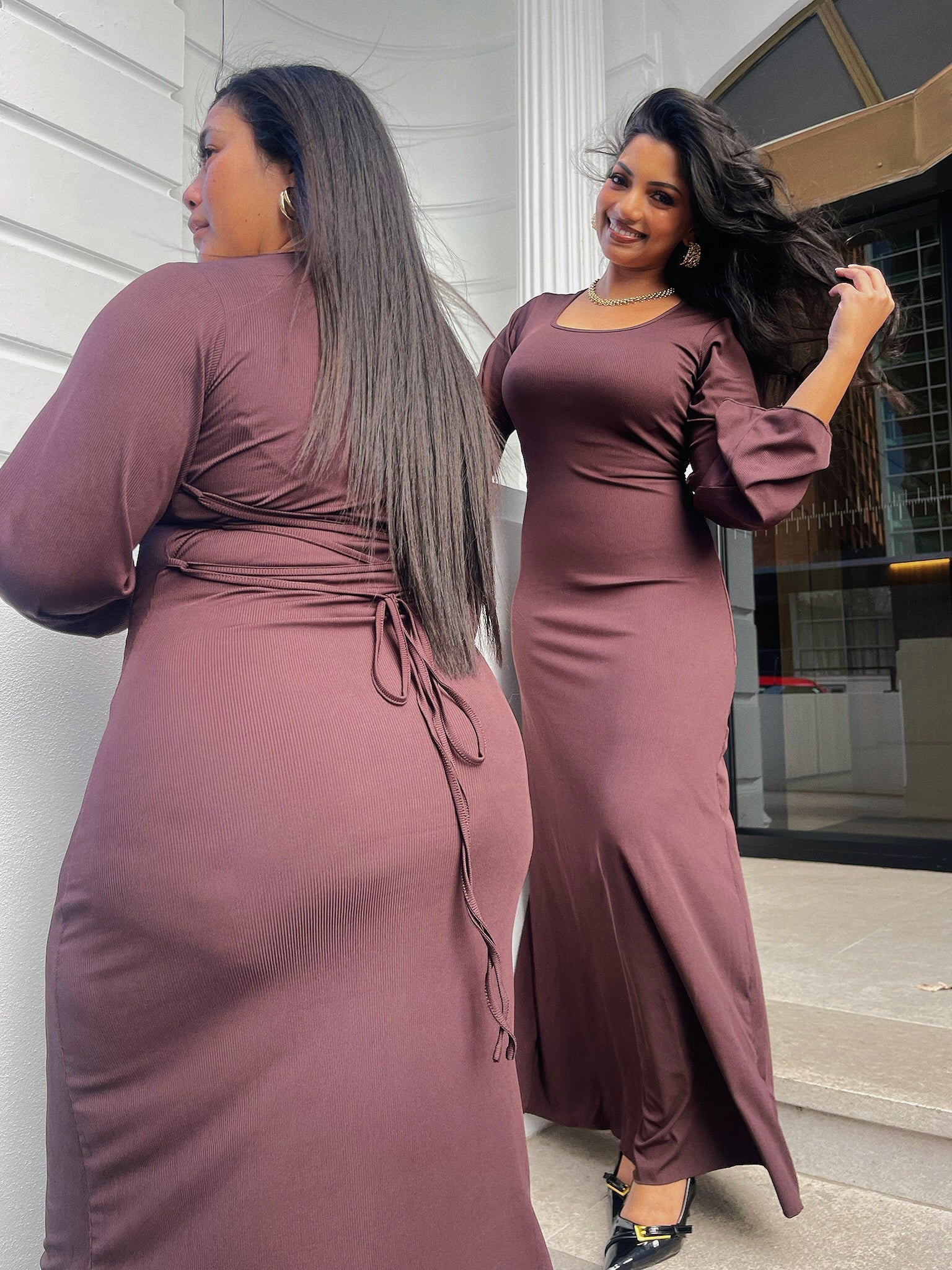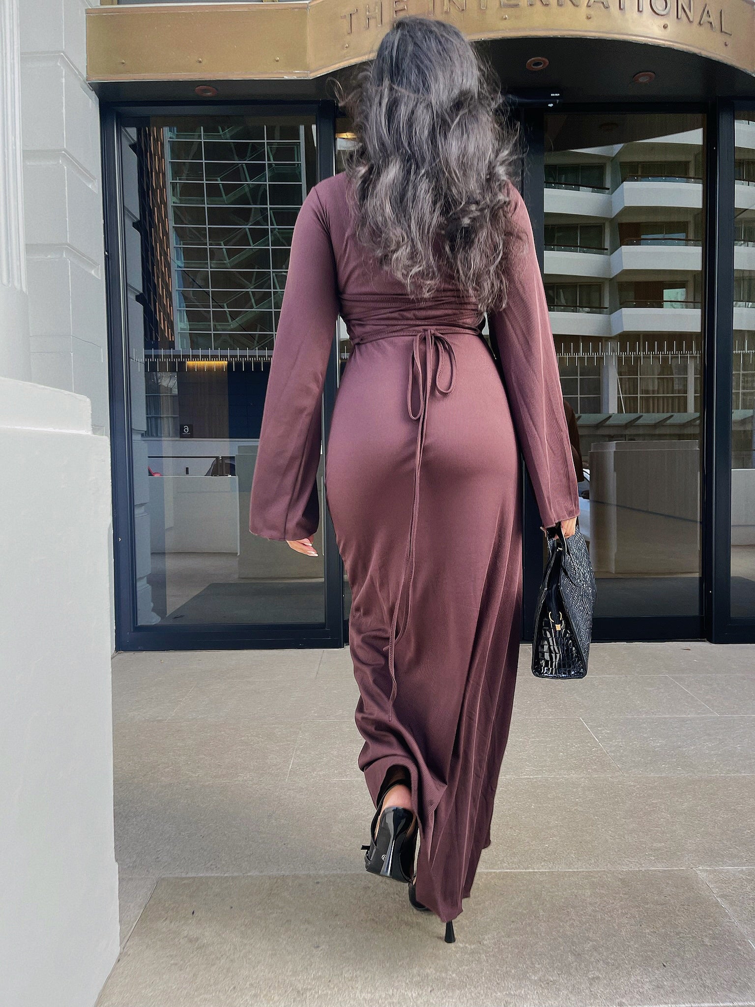 Long-Sleeve Maxi Bodycon Dress, Winter Must-Have Dress, Stretchy Rib Fabric Dress, Back Knot Tie Support Dress, Flared Sleeve Dress, Feminine Touch Dress, Elegant Bodycon Dress, Rome-Inspired Dress, Curves Accentuating Dress, Women's Winter Fashion.
