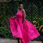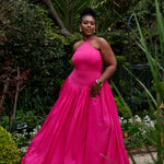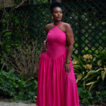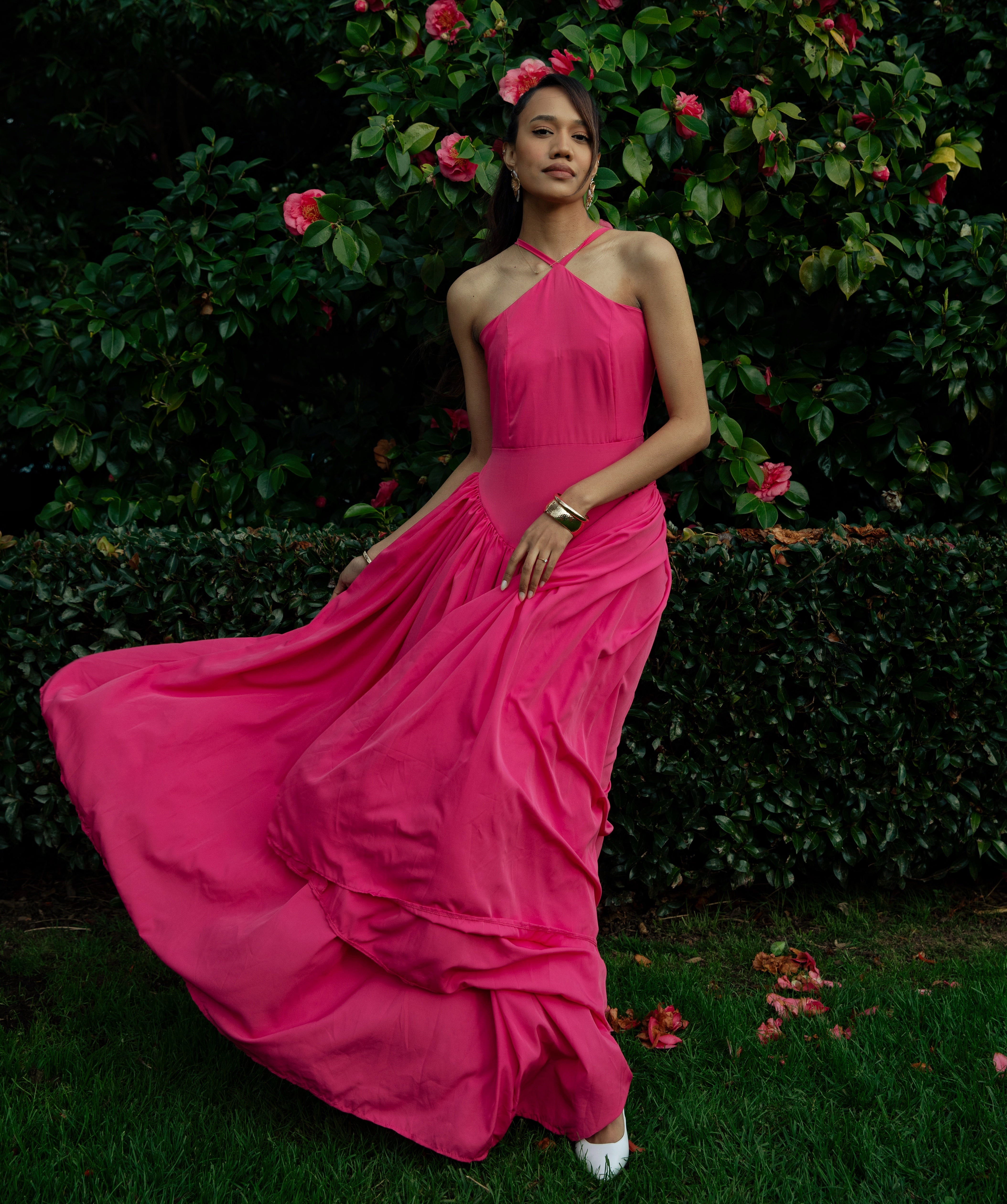 Our "Pink Vibrancy" maxi dress is a sleek and chic option that ensures all eyes are on you at your next event. Crafted from sustainable stretch crepe, this dress features a sweeping halter neckline and a gathered elegant midi hem that adds a touch of sophistication. The design is completed with a discreet zip at the back for a seamless fit.